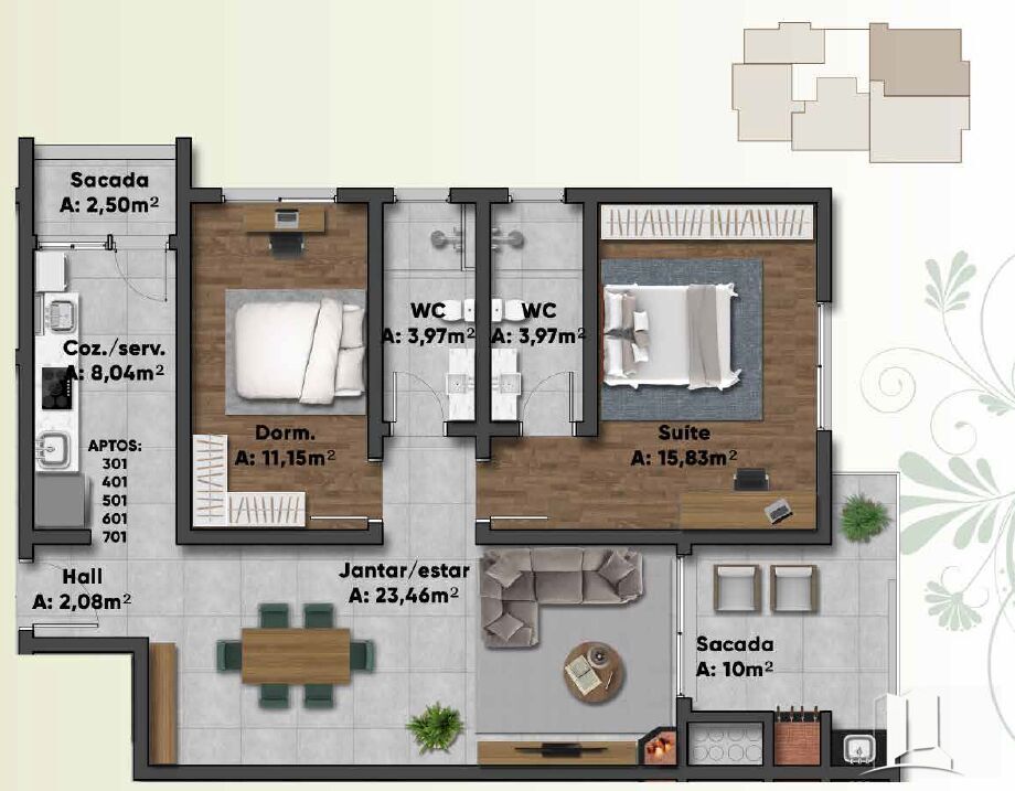 2 Dormitórios, sendo 1 suíte1 Banheiro1 VagaGaragem Coberta1 Sala de TV1 Sala de jantar1 Área de serviço