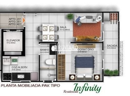 Comodidades:Área de serviço, Banheiro social, Churrasqueira, Hidrômetro individual, Sacada, Estar social, Cozinha, Sala de estar, Sala de jantar, Elevador, Portão eletrônico.